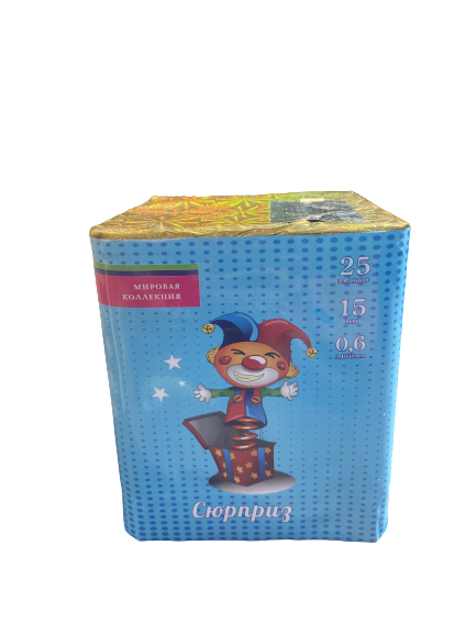 Название салюта: Сюрприз(МБ-0258) Артикул: МБ-0258 Калибр: 15 калибр Зарядов: 25 залпов Длительность: 35 секунд